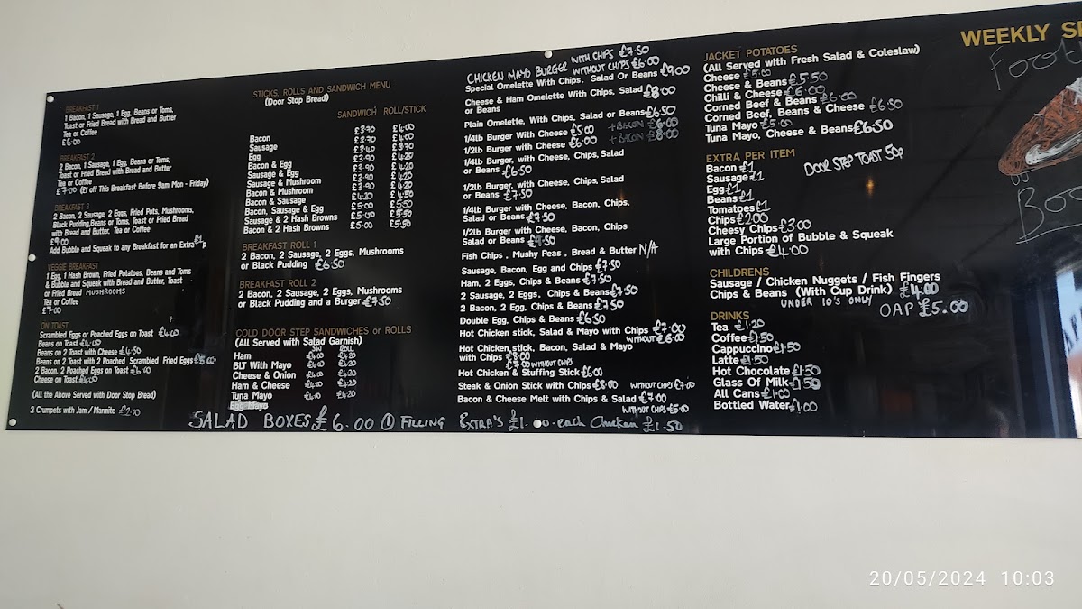 The menu showcases a delightful variety of options that fuse comfort and satisfaction. For those like Douglas Rowlinson, who can't resist a classic start to their day, the Full English breakfast choices offer excellent value, featuring ingredients that are juicy, fresh, and cooked to perfection. Alternatively, a light yet filling meal can be found in their selection of Cold Door Step Sandwiches or Rolls, with options such as the savory Tuna Mayo or the classic Ham & Cheese sandwich. For a little twist, their Jacket Potatoes, topped with gooey Cheese & Beans or spicy Chilli & Cheese, are not to be missed. And don't forget to wash it down with a perfectly brewed cup of coffee or a rich Hot Chocolate, perfect for cozying up indoors.
